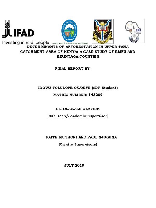 Kenya is considered to be a low forest country with a forest cover that is lower than the internationally accepted threshold. Deforestation in the country‘s water towers is estimated at 50,000 hectares annually, with a consequent yearly loss of over USD 19 million. Surprisingly, Kenya‘s tree cover, which was 1.7% in 2013 is now at 7.2% (KFS,2016). The partnership between the Global Masters in Development Practice and International Fund for Agricultural Development (IFAD) initiated the IFAD Universities Win-Win Partnership grant which was awarded to carry out a survey on the Determinants of Afforestation in Upper Tana Catchment Area: A case study of Embu and Kirinyaga Counties after consulting the supervisors from the Upper Tana Natural Resources Management Project (UTaNRMP) and the Centre for Sustainable Development (CESDEV), University of Ibadan (UI).