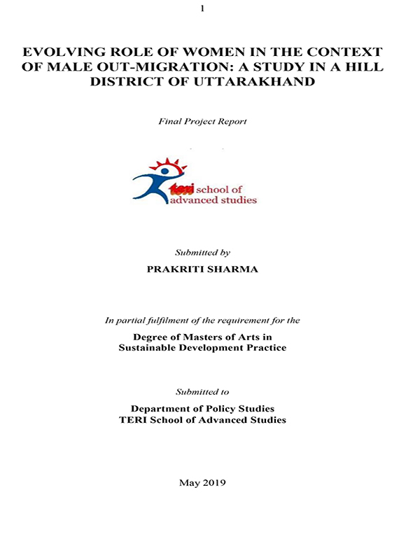 Excessive rates of male out-migration in the hill districts of Uttarakhand have led to changes in the rural production system and the sociocultural structures of the villages. There have been observable changes in the lives of these women left-behind; from the workload to the amount of responsibility they hold in the household and the livelihood options they follow. This research, using the Sustainable Livelihoods Framework, aims to delve deeper into this vulnerable context and map changes in the lives of women due to male-outmigration. Further, it aims to assess the role of the livelihood intervention - Integrated Livelihood Support Project (ILSP) by International Fund for Agricultural Development (IFAD) – India, in this dynamic setup. The study design adopted a case-control approach choosing three villages of Almora district. Mixed method was used for data collection which included household surveys, interviews with 80 women, focused group discussions and participatory rural appraisal tools. The analysis of data revealed that women and young girls were overburdened with reproductive roles that left them with no time to invest in productive activities. Although women were engaged in farm activities, in the absence of property rights and recognition as ‘farmers’, they were seldom able to exercise control over means of production. Their access to economic decision making was limited. The only difference was where women from households with out-migrated male members considered themselves as ‘temporary household head’ with the power to make decisions pertaining to household expenditure. Multiple livelihood projects like ILSP through its association with the vulnerable groups, helped the farmers connect to the market. This association was slow to scale up in the study areas due to absence of adequate processes and incomplete visualisation of the context and the asset sets. The women respondents perceived some benefit from the group association through enhanced social capital that could help them cope with stress conditions, particularly in the absence of male counterparts. The study further provides recommendations to fill the gaps observed.